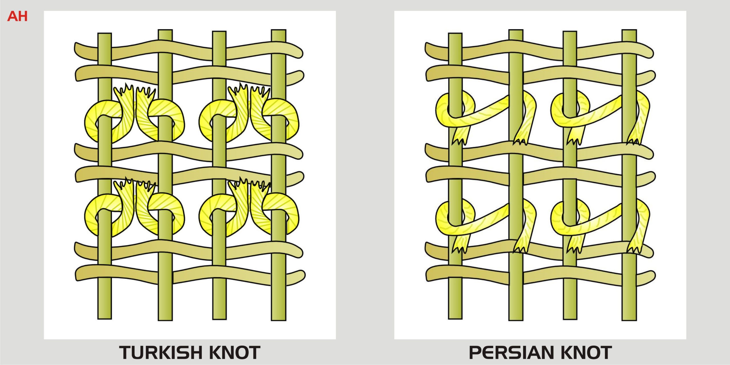 TURKISH KNOTS: The Turkish knot is symmetrical and leaves two little bumps on the back of the rug within each knot, giving it the appearance of a double knot. This knot is more common in Turkey, Armenia, Azerbaijan, and northern Iran.