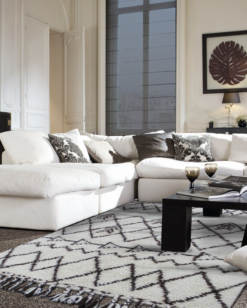 A black or blue carpeting on any neutral tone can work in most rooms, and it’s a proven combo. For bedrooms, playrooms, and even foyers, a black and white pattern rug can serve as a solid foundation for a kaleidoscope of colours.